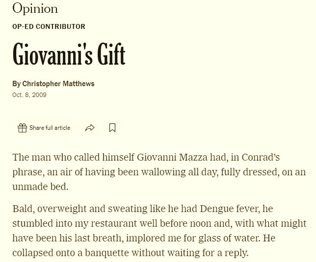 Nick pulled up as two guys stepped out of the restaurant speaking in Italian. They embraced, then Giovanni Mazza entered Nick’s cab.